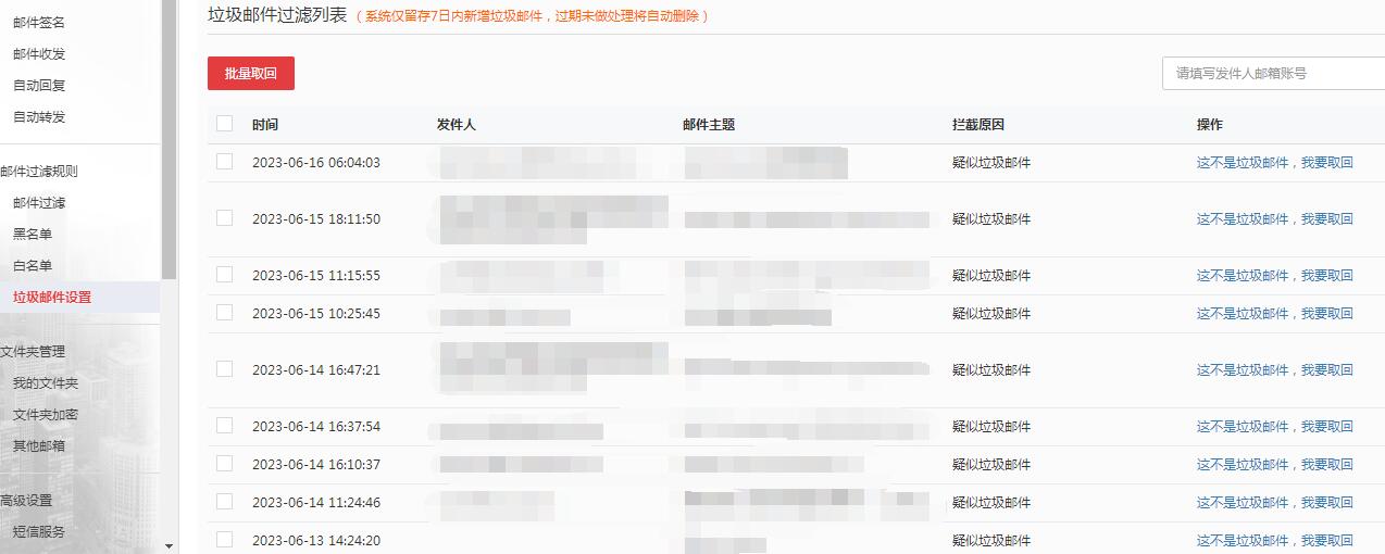 完成设置并保存成功后,垃圾邮件设置页将会显示当前邮箱7日内被反垃圾网关判定为疑似垃圾邮件的列表,如下图: