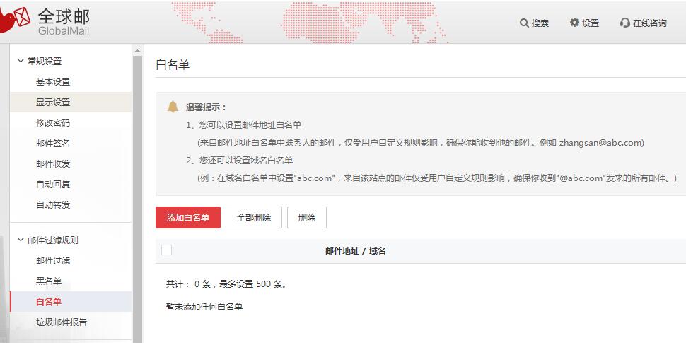 (例:在域名白名单中设置"abc.com",来自该站点的邮件仅受用户自定义规则影响,确保你收到"@abc.com"发来的所有邮件。)